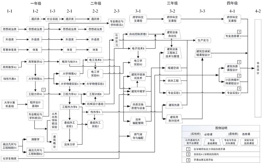 工程热力学、流体力学、传热学、建筑环境学、热质交换原理与设备、流体输配管网、建筑环境测试技术、暖通空调、建筑用制冷技术、建筑热源、供热工程、燃气储存与输配、建筑设备自动化、建筑设备工程施工技术与管理。