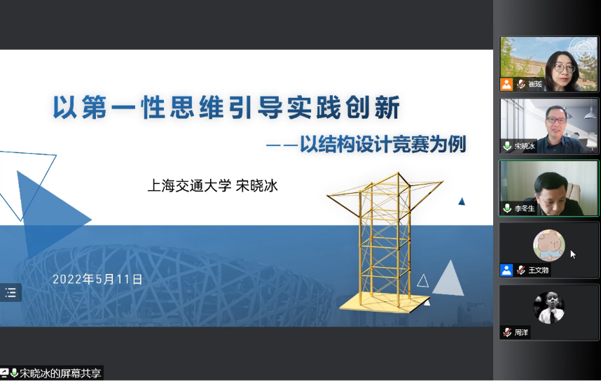 5月11日下午,建设工程学部“知行致远讲堂”第17期宋晓冰教授“畅谈结构模型设计“在线上如期开展。本次讲座由建设工程学部土木工程国际班专业负责人崔瑶副教授主持,建设工程学部副部长李冬生教授出席嘉宾,特别邀请到“结构设计大赛金牌教练”上海交通大学土木工程系宋晓冰教授担任主讲人,讲座主题为“以第一性思维引导实践创新—以结构设计竞赛为例”。百余名本科生通过线上方式参与活动。
