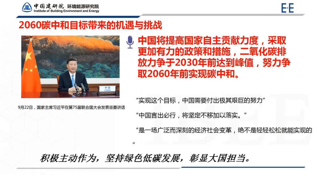 徐伟研究员以国家主席习近平在第75届联合国大会发表的“碳达峰、碳中和”讲话为开篇,介绍了中国建筑碳排放的发展现状,并以此为背景展望了建筑行业新机遇和挑战,阐述了建筑领域实现“双碳”目标的措施。