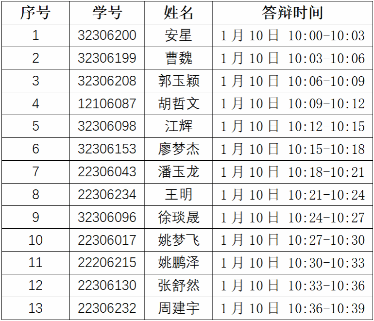 进入答辩的同学请在1月9日15:00之前将答辩PPT命名为“序号-姓名”发送至邮箱jiangongyjszzb@163.com,工作人员会统一将PPT拷贝至现场。请根据答辩时间安排,提前10分钟在会议室门口等候。