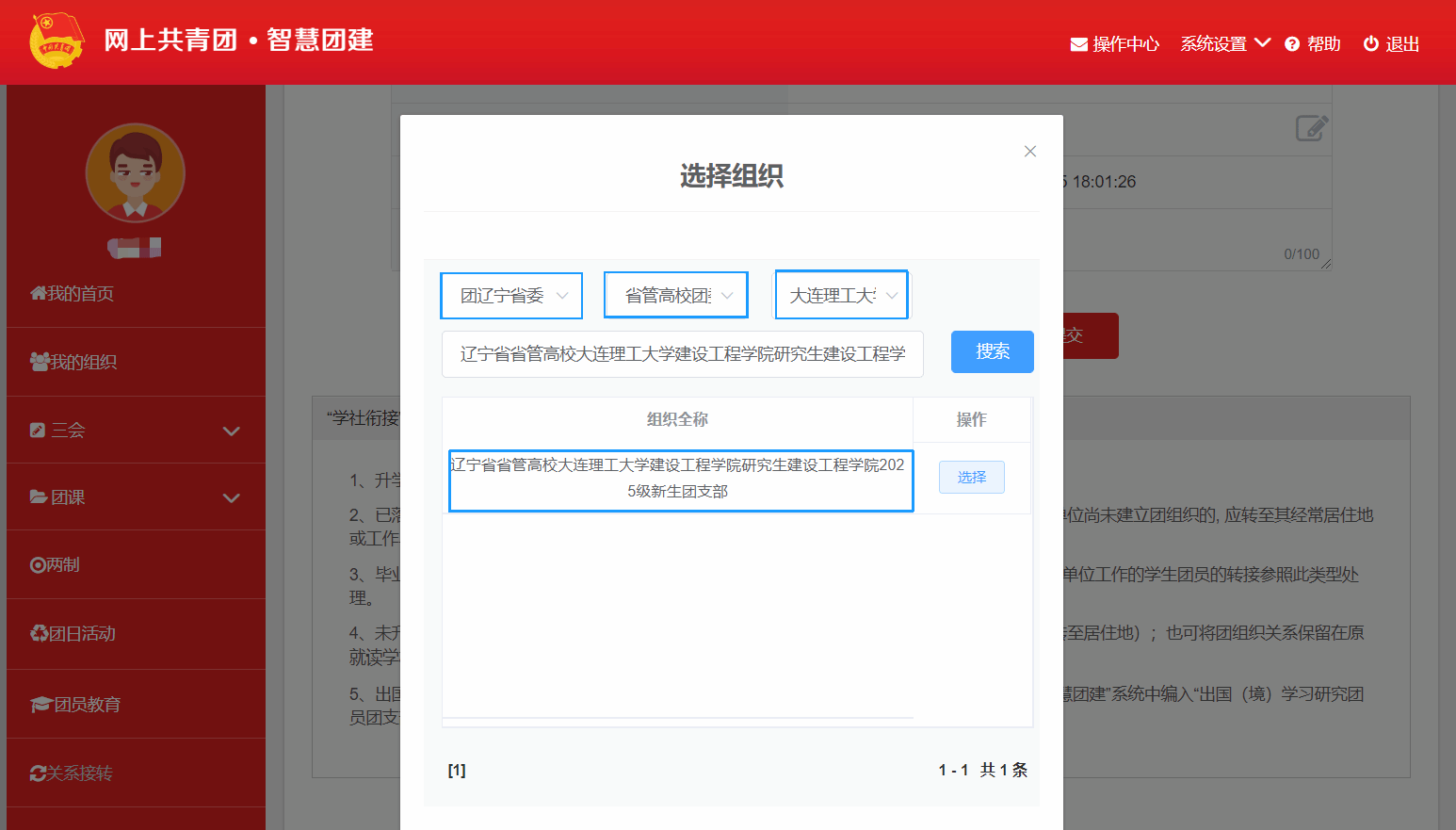 2.【转出原因】选择“升学”,【申请转入组织】选择“辽宁省省管高校大连理工大学建设工程学院研究生建设工程学院2025级新生团支部”,然后提交转接申请。
