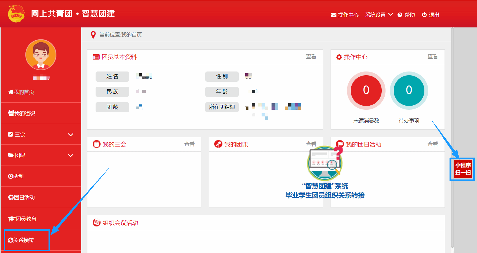 1.在电脑端登录(也可在微信中扫以下二维码/搜索“团中央智慧团建云平台”小程序进行登录操作)本人的智慧团建账号(网址:https://zhtj.youth.cn/zhtj/),点击左侧一栏的“关系转接”,填写信息表。在备注中必须写明姓名-录取院系-录取专业-导师,方便管理员进行核实。