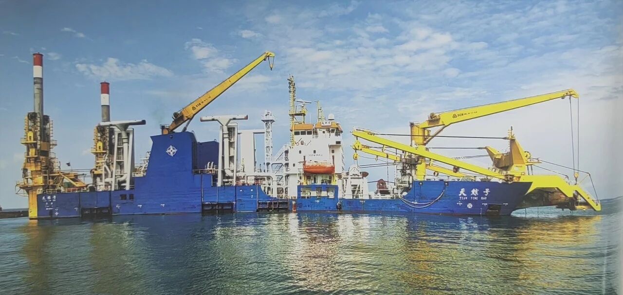 “天鲸号”绞吸挖泥船:国家重点工程“功勋船舶”,全船长127.5米,宽23米,最大挖深30米,总装机功率20020千瓦,设计每小时挖泥4500立方米,绞刀额定功率4200千瓦。