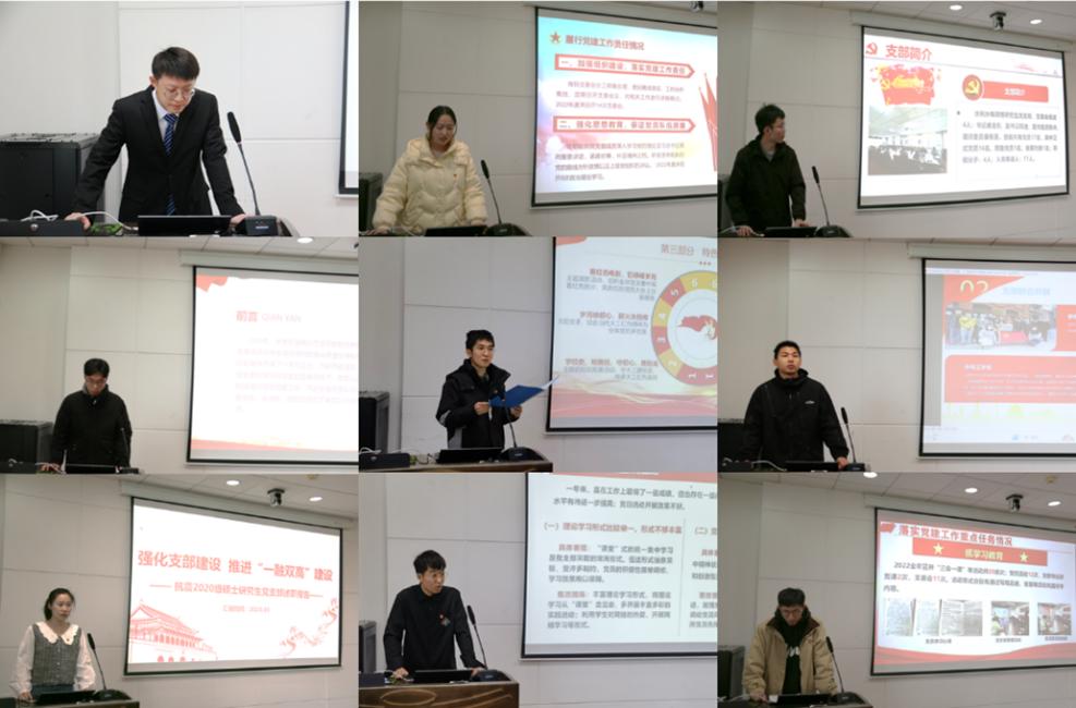 来自桥梁硕博研究生党支部等9个学生党支部的支部书记就2022年度基层党支部工作依次进行现场述职,围绕履行党建工作责任情况、落实党建工作重点任务情况、上年度查摆问题整改落实情况、存在问题和改进思路举措等方面进行汇报。
