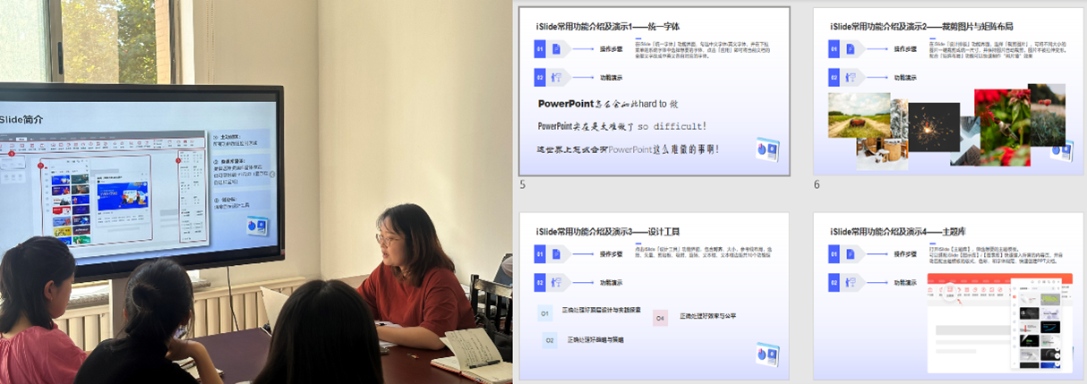 支部宣传委员丁艺菲从加强汇报内容组织能力、优化汇报呈现方式等方面出发,进行了PPT实用工具的推荐与分享,并对工具的各项常用功能进行了现场演示和案例实操,以期通过分享帮助大家提升效能。