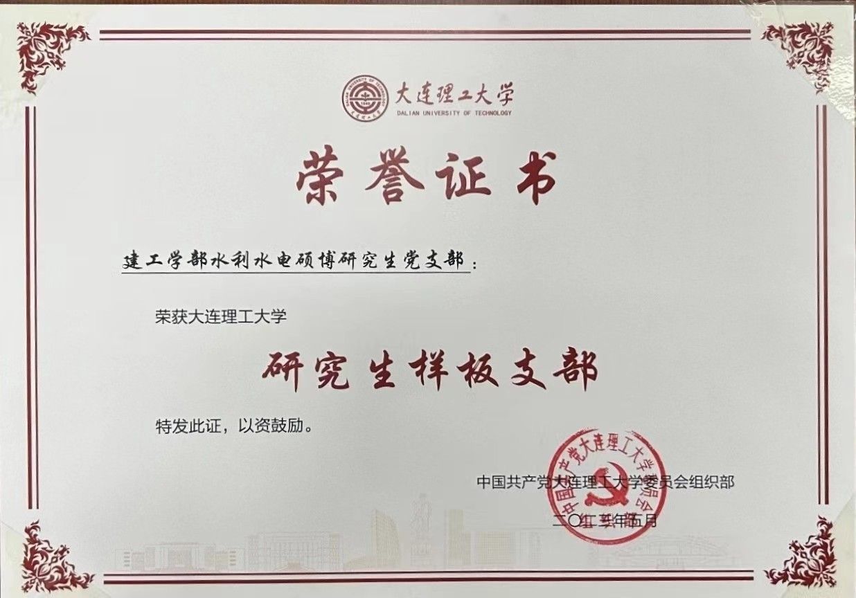 样板引领,标杆激励。近年来,建设工程学院水利水电硕博研究生党支部认真学习贯彻党的政策方针,在学校、学院上级党组织的领导下,积极推动学校“一融双高”建设,严格对标支部建设“七个有力”的标准,探索新时代研究生支部党建工作方法,打造“水利青年”党建品牌。支部获批2023年大连理工大学党建工作“研究所样板支部”。