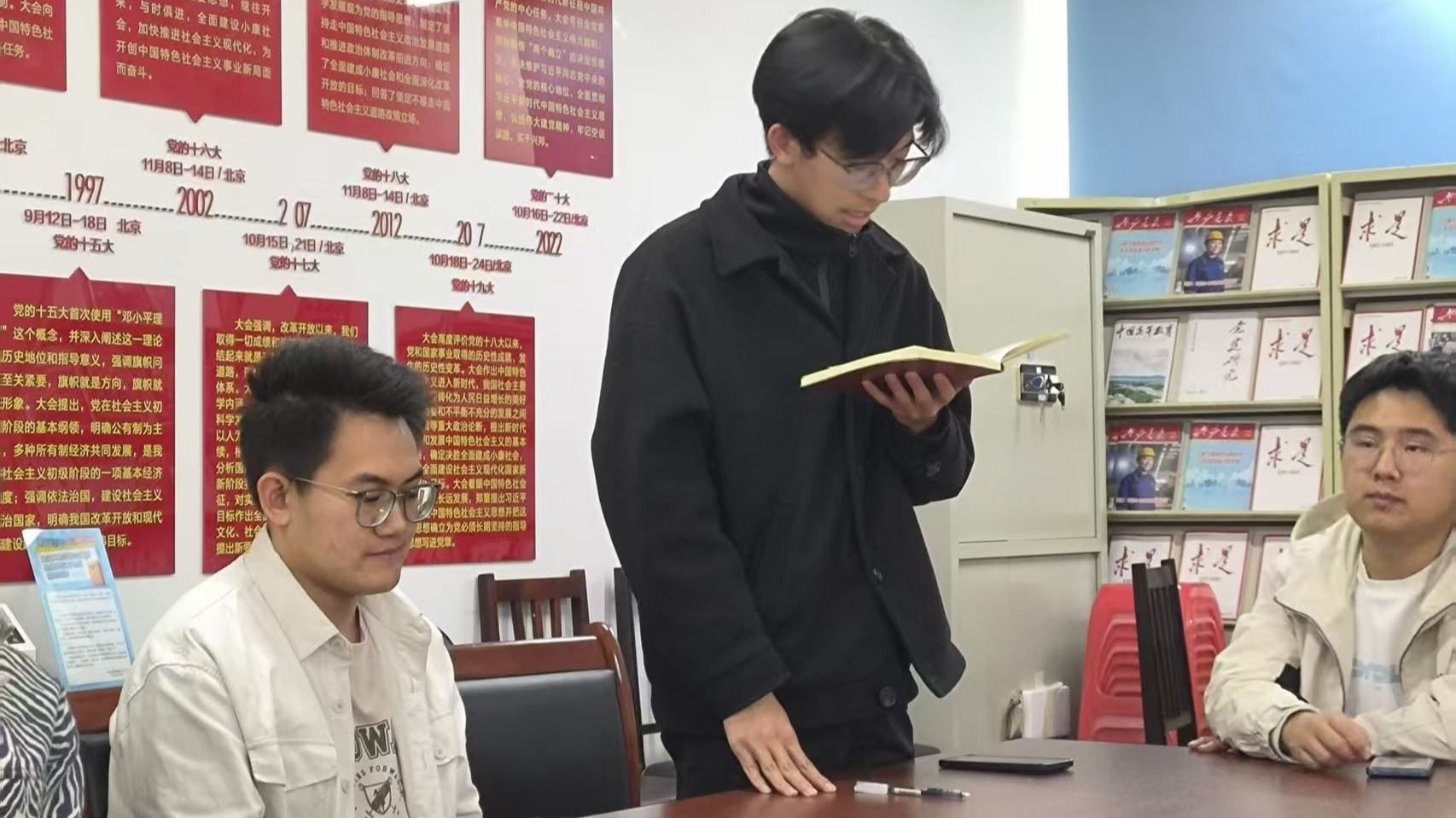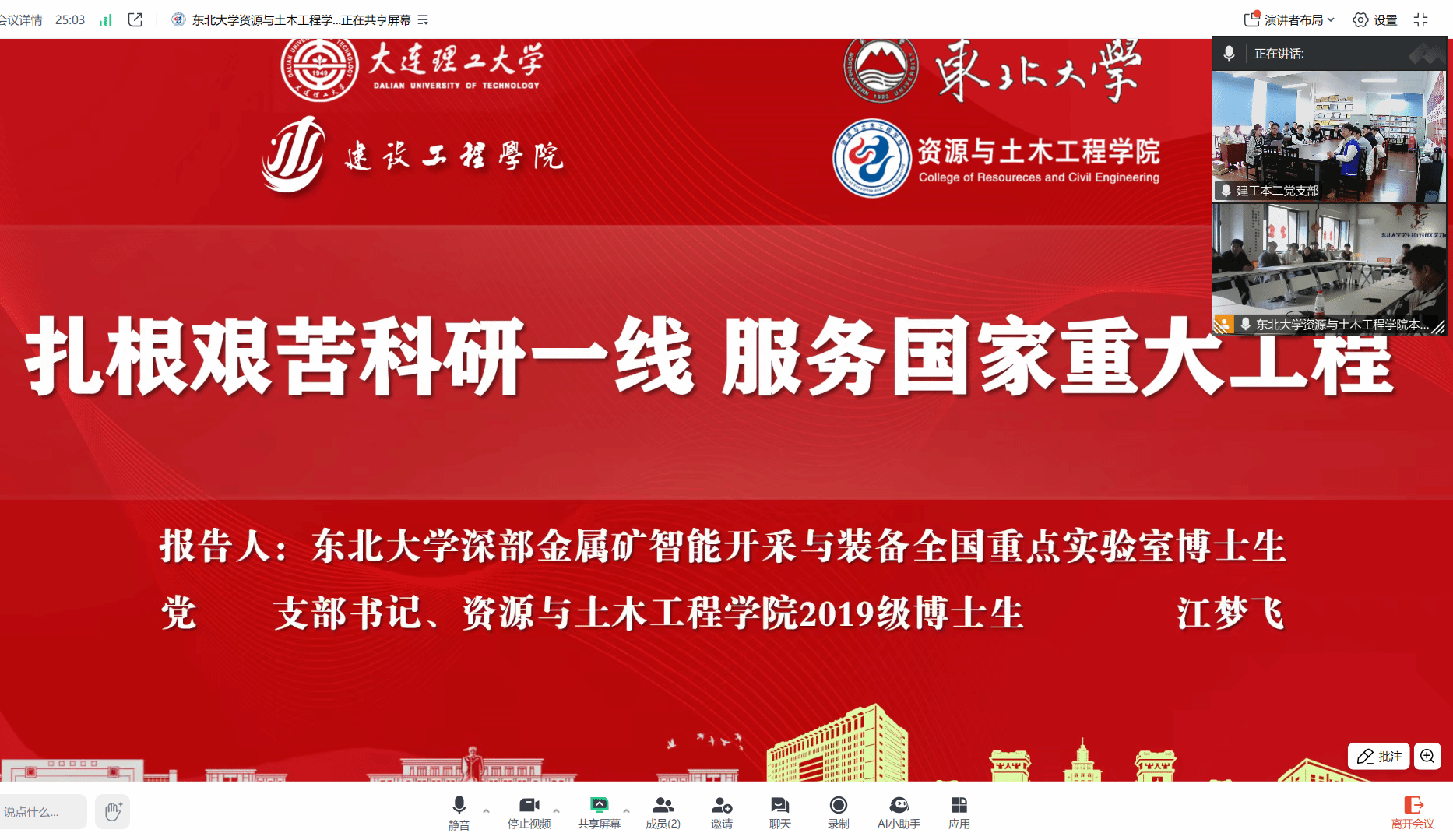 东北大学深部金属矿智能开采与装备全国重点实验室博士生党支部书记、资源与土木工程学院19级博士生江梦飞以“扎根艰苦科研一线,服务国家重大工程”为主题,分享了深部金属矿智能开采与装备全国重点实验室在科研攻关中的实践经验。他强调,青年党员应以实际行动践行初心使命,为国家的科技创新贡献力量。