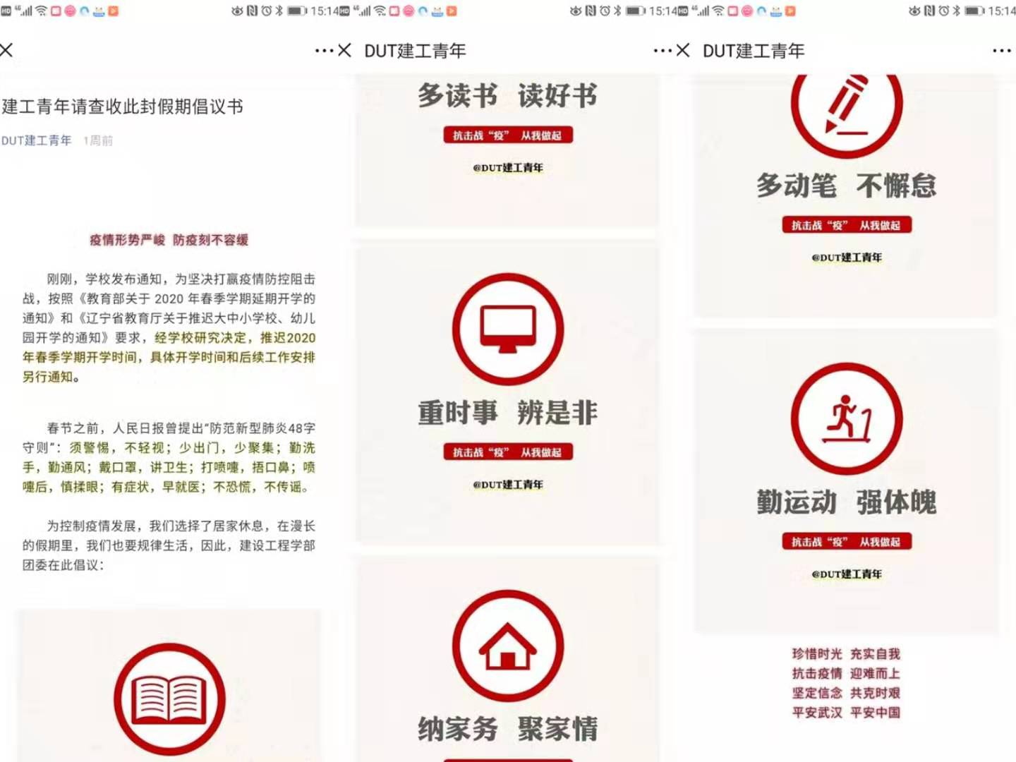 当前,全民参与的新型冠状病毒感染肺炎疫情防控阻击战正在进行。数据实时更新,病例节节攀升,每个人都在时刻关注疫情的发展变化。生命重于泰山,疫情就是命令,防控就是责任。建设工程学部党委迅速行动,坚决执行疫情命令,全面落实防控责任,对疫情防控工作进行研究部署,统一制定工作方案和具体工作安排。学部区分教职工、本科生、研究生三类群体,分别做好防控工作,做到宣传动员到位、工作布置到位、落实检查到位,保证全面覆盖,不留死角。先后组织完成了师生情况摸排、防控宣传教育、特殊情况处置、假期生活指导等一系列工作。