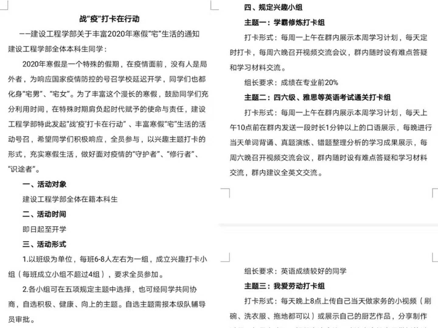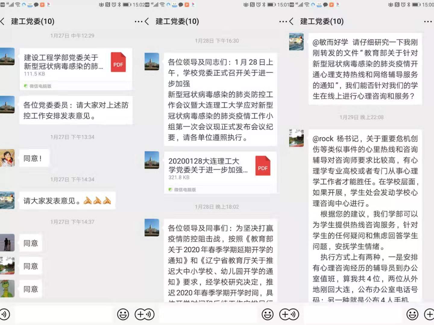 为了进一步做好疫情防控工作,科学应对延迟开学的工作影响,建设工程学部党委制定了《党旗飘扬 疫情防控有作为 特殊假期不虚度——关于当前疫情防控工作的指导意见》(以下简称《指导意见》),要求各党支部坚守堡垒,要求全体党员干部亮明身份,进一步落实学校部署,做好情况排查和统计报告工作;进一步密切联系师生,做好党员群众的宣传教育工作;进一步沟通交流,关心师生群众的身心健康,在疫情防控、服务师生中自觉接受党性锻炼和严峻考验,影响和带动广大师生增强信心、战胜疫情。
