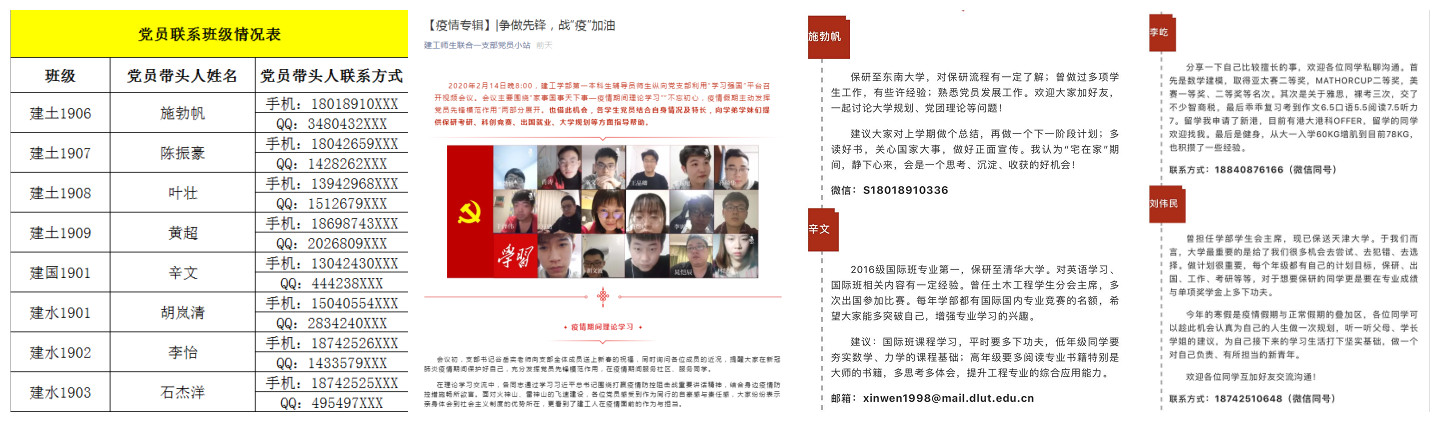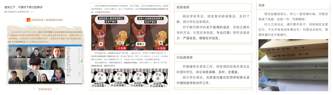 教育,为学业困难学生提供帮助,帮助学生解决实际问题;每周召开一次线上党支部视频会议,学习战“疫”期间先进事迹,要求党员同志在所在团支部、在联系班级、在家乡做好科学的传播者、谣言的粉碎者、健康的守护者、家庭的关爱者。