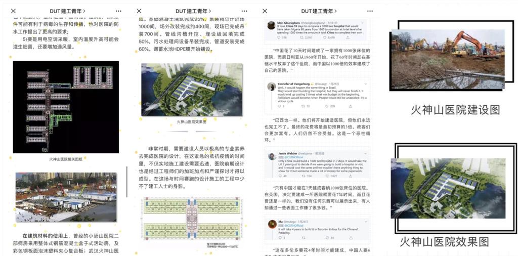 疫情发生以来,学部依托“DUT建工青年”推送《关于新型病毒,这些你该知道》、《建工青年请查收此封假期倡议》、《“工程监工”倒计时,建工青年成长进行时》、《汇聚温情,分秒必争!“基建狂魔”再现中国速度!》等多篇原创推送。推送疫情防控正确知识,号召建工青年不信谣、不传谣;结合专业对火神山、雷神山两所医院建设过程进行解读,增强专业自豪感,培养建工青年迎难而上、挺身而出的奉献担当精神。