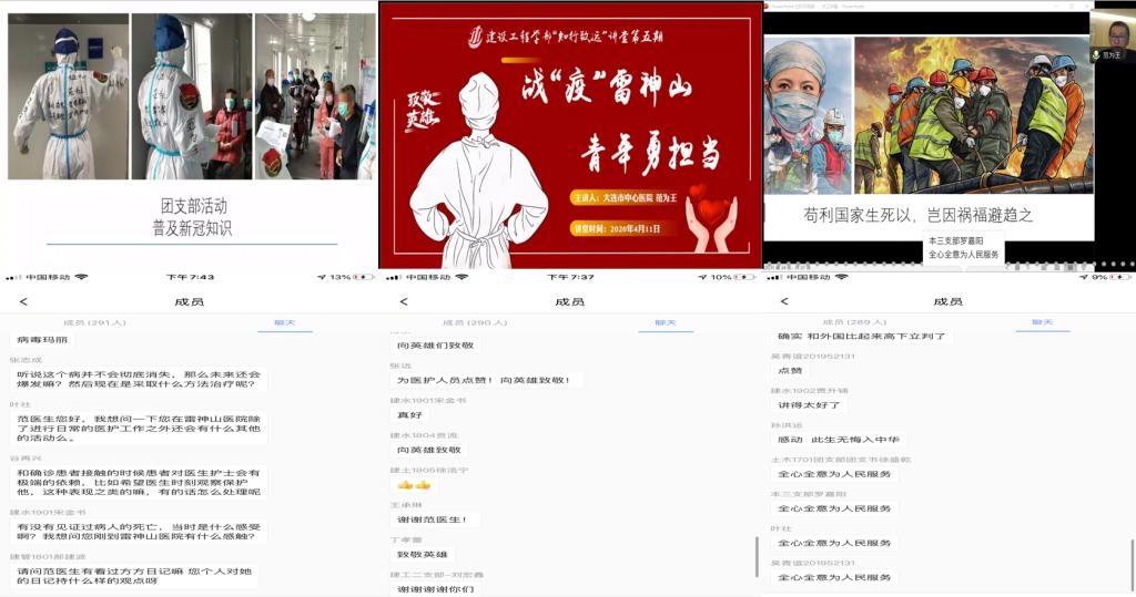 “此生无悔入中华”、“全心全意为人民服务”、“向英雄致敬”,学生们在讲座过程中自发刷屏。“参加今天晚上的知行致远讲堂真的是近期我最有意义的一件事”、“深受感动,吾辈当以国祚为任,砥砺前行”,讲座结束后,对英雄的敬意刷爆了学生们的朋友圈。这是一堂生动的爱国主义教育、专业理想教育、感恩报国教育思政课,一名90后医生的爱国情怀和奉献热情,激发了建工学子的爱国情、报国志。