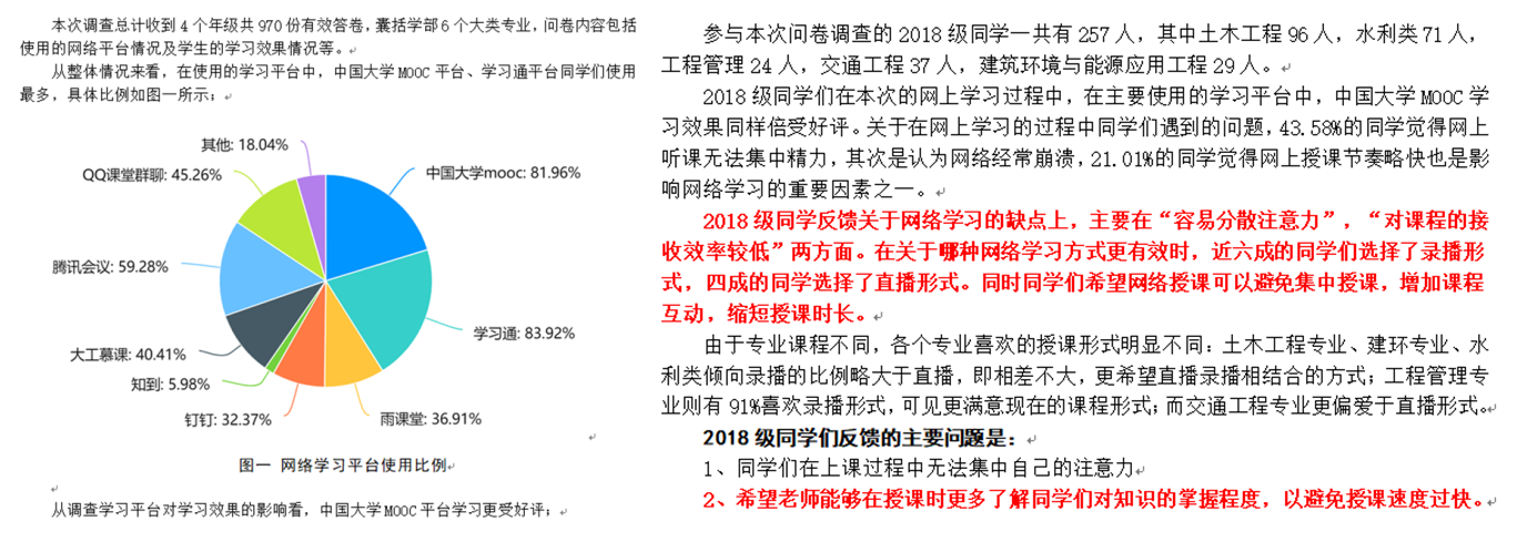 深入学生、了解学生,掌握学生思想动态及生活状态,对接学生的实际需求,有层次、有针对性的开展各类指导是疫情下思政工作的重点。学部密切关注学生居家学习质量,面向全体本科生开展调研,从网络课堂质量、网络授课形式等不同侧面充分了解各年级、各专业的不同需求。针对2017级港口航道与海岸工程专业网络开课少、水利水电工程课后作业过多等实际问题,积极向专业教师、学部反馈,学部充分调研、积极协调,为学生解决实际问题,保证网络学习质量与效率。