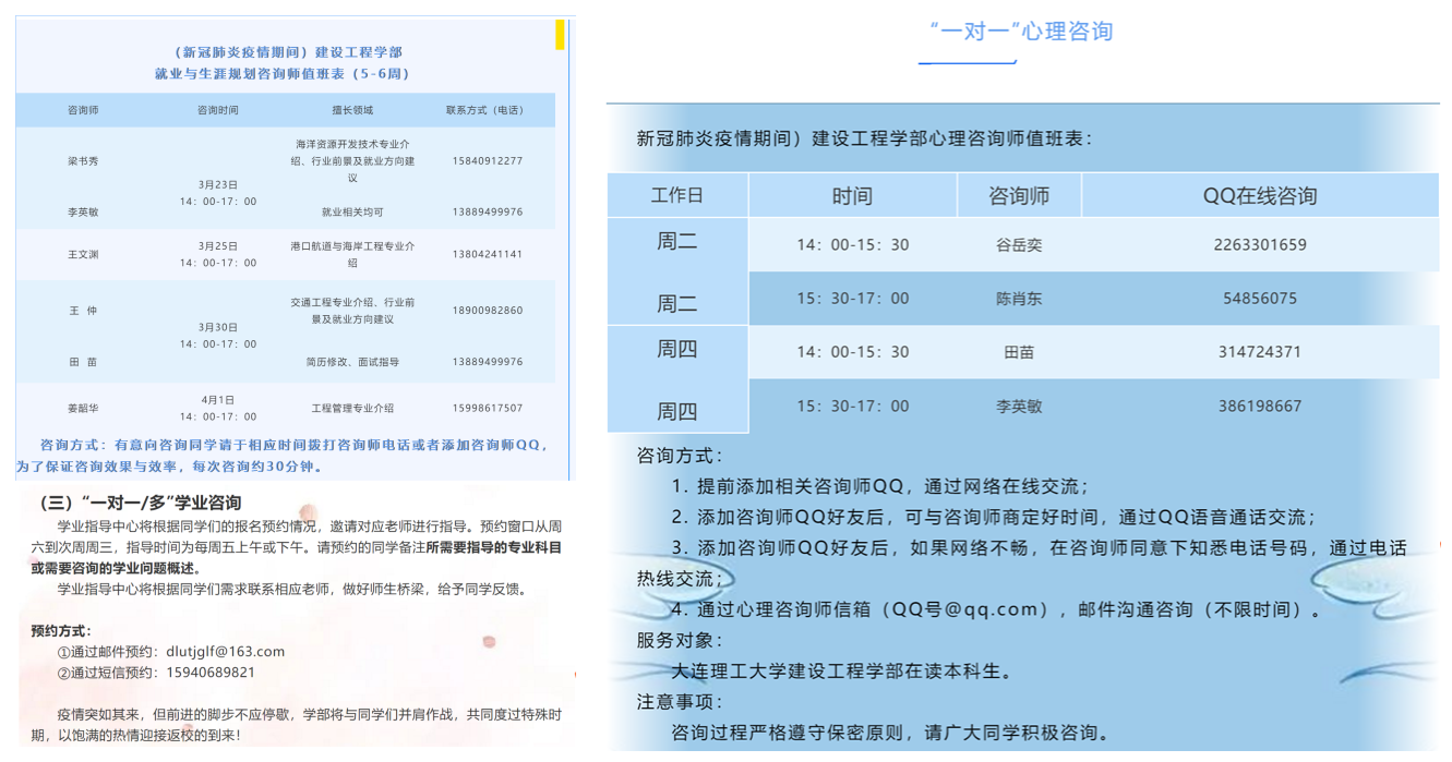 “一对一线上咨询”高频率开放解决个性问题。就业、学业、心理“一对一”咨询有效搭建了为学生答疑解惑的桥梁。面对疫情特殊情况,学部加大咨询力度与频率,由“周周有咨询”拓展到“日日有咨询”,学部领导班子、各专业负责人、学部心理咨询师全部加入到咨询师队伍,为学生心理健康、生涯规划、学业成长、就业指导保驾护航。目前,已为十余名学生提供简历、行业选择、签约流程等一对一指导,助力其顺利签约。