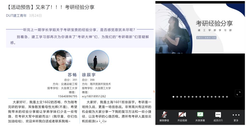 三年级学生面临特殊考研季,如何在疫情下合理安排考研计划,提高复习效率,学部开展2场“线上考研经验分享会”,累计近300人参与,会上耐心讲解考研中重要时间节点、深入分析各辅导老师的授课风格及不同复习资料的特点,为同学们的复习之路提供有效建议。