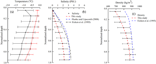 北极太平洋扇区夏季海冰(a)温度、(b)盐度、(c)密度垂直剖面
