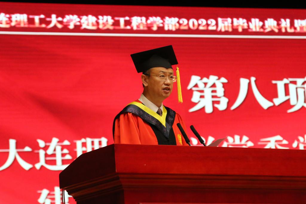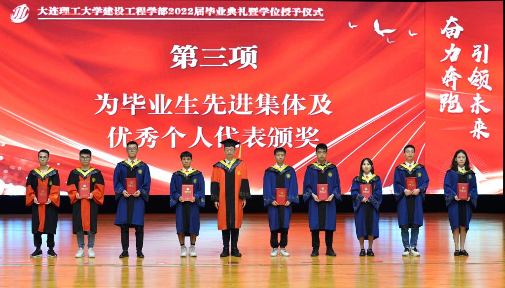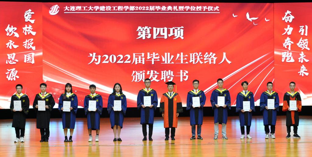 奏响国歌之后,建设工程学部副部长李钢教授宣读毕业生先进集体、优秀个人名单,大连理工大学党委常委、副校长、建设工程学部部长张弛教授为获奖代表颁发证书。随后,建设工程学部副部长李钢教授为2022届毕业生联络人颁发聘书。