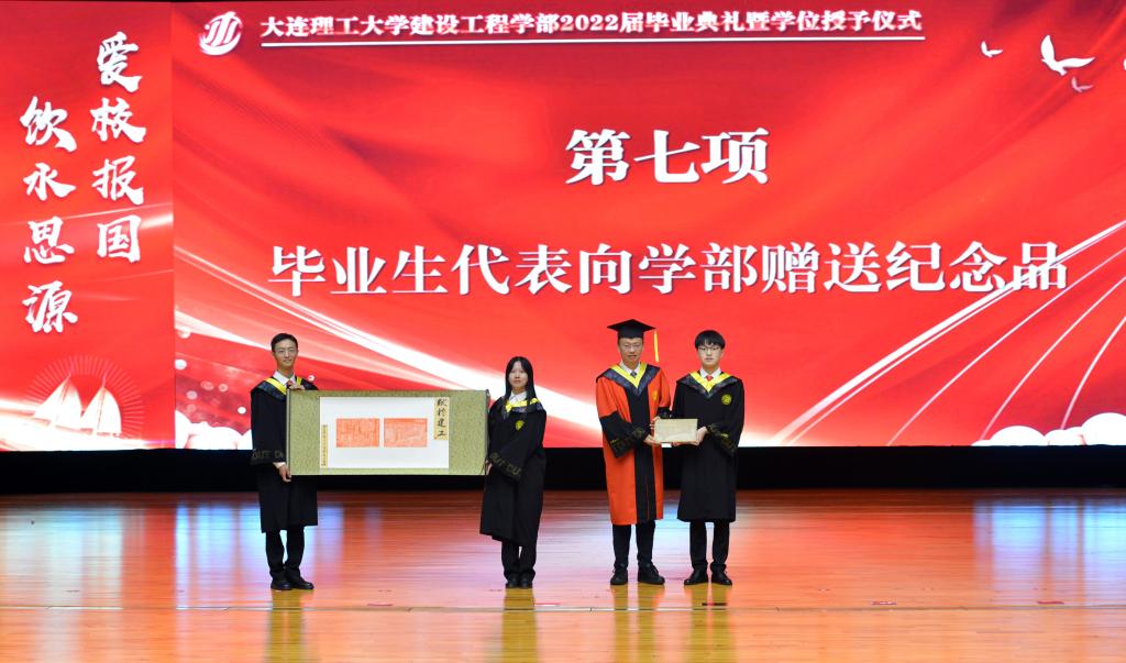 2022届本科生毕业生代表、土木工程专业邢增良同学回顾了大学四年的时光,表达了对母校的眷恋、对同学的祝福,并与学校相约2049年百年校庆,希望能以优异的成绩骄傲地向母校报告。2022届研究生毕业生代表、水文学及水资源专业硕士宋赟祯同学回望在大工的八年过往,表达了未来“做拥有智慧并富有激情的人、做胸怀大智并脚踏实地的人、做富有责任并敢于承担的人”的决心,并衷心祝愿母校、学部大展宏图、再谱华章。为表达对母校、学部的感激之情,2022届毕业生亲手刻制以厚兴楼为主体的《上善若水》和《我爱建工的100条理由》,并在宣纸上拓印成画,作为毕业礼物赠与学部,表达毕业生们对学部最真挚的祝福。