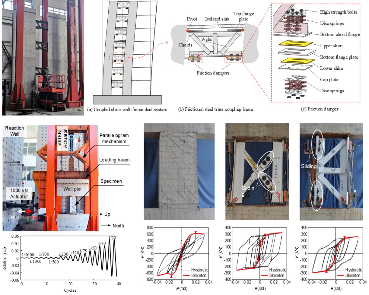 建设工程学部崔瑶副教授团队针对在传统钢筋混凝土剪力墙结构中,连梁在地震下塑性发展不明确、不易修复等性能缺陷,创新研发一种“摩擦钢桁架连梁”,在钢桁架连梁变形集中的部位设置可拆卸摩擦装置,连梁的变形能力由摩擦装置的滑移长度决定,通过调整连梁桁架和可拆卸摩擦装置的布置实现承载力和刚度解耦设计。建立了摩擦钢桁架连梁承载力、刚度和变形的理论计算公式,发展了适用于抗震分析和设计的理论滞回模型和宏观模型。摩擦钢桁架连梁传力路径清晰、受力明确、构造简洁,具有损伤可控、震后功能可恢复、强度-刚度结构、弯剪分离等优点,且滞回性能可准确预测与设计,为发展韧性结构构件和体系提供新的思路及设计理论依据,对提升我国工程结构防灾减灾能力有重要的科学意义和工程价值。
