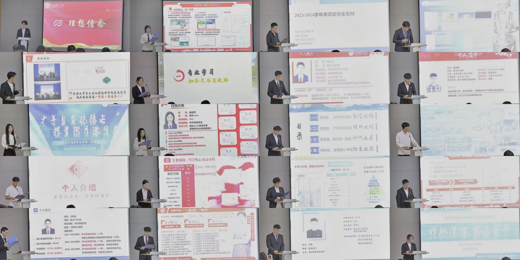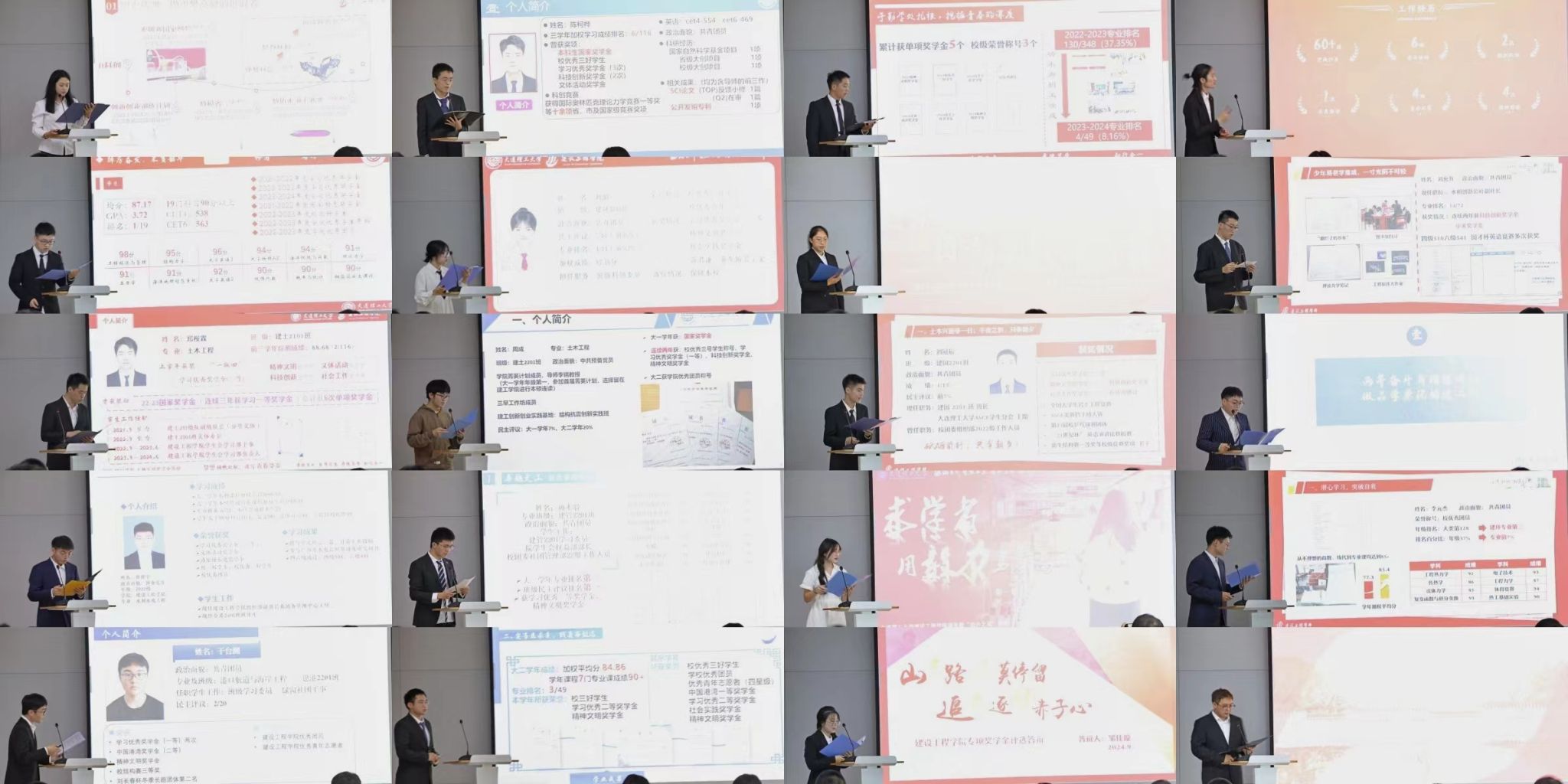评选现场,进入最终打擂的54位大额奖学金候选人以及19位“建工之星”候选人以积极向上,昂扬自信的态度展现出他们在科创、文体、服务同学等方面的优秀品质和卓越成绩。其中有人作为学院学习部部长,坚持为学院学风建设发光发热,帮助十余位同学实现专业难课成绩翻倍式增长。有人矢志科创实践,克服困难,百余场活动,十余张证书印证了他的科创热爱。还有人短短一年将成绩提高60%以上,从专业百名开外进步到如今的专业第二,百余页笔记印证了他的坚毅成长。