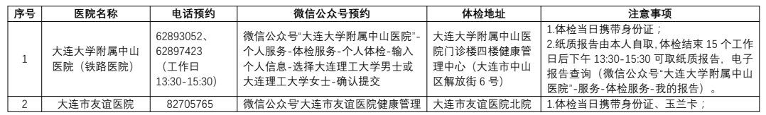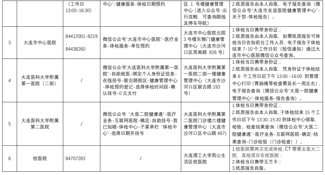 2、为确保获得优质服务,校工会协调大连市5家三甲医院为我校在职教职工制订了专属体检项目(详见附件),教职工可选择体检项目内的套餐进行体检,也可在学校限定的标准额度内自选项目体检。