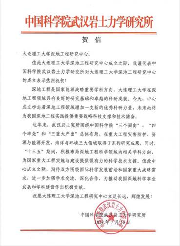 中国科学院武汉岩土力学研究所对大连理工大学深地工程研究中心的成立发来贺信。贺信指出,深地工程是国家能源战略的重要学科方向,大连理工大学在深地工程研究方向具有良好的研究基础和卓越的科研成就。并期待双方未来继续围绕国际科学发展前沿和国家重大战略需求,进一步加强学术交流,深化合作,为推动我国深地科学事业发展和学科建设做出积极贡献。