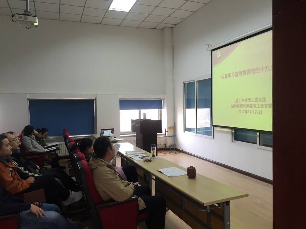 11月29日,在学部四号楼6楼,交通运输学院教工党支部、结构监控与测量教工党支部一起学习宣传贯彻党的十九大精神,会议由交通党支部书记潘宝峰教授主持,两个党支部的党员与群众20余人参加了本次学习研讨。