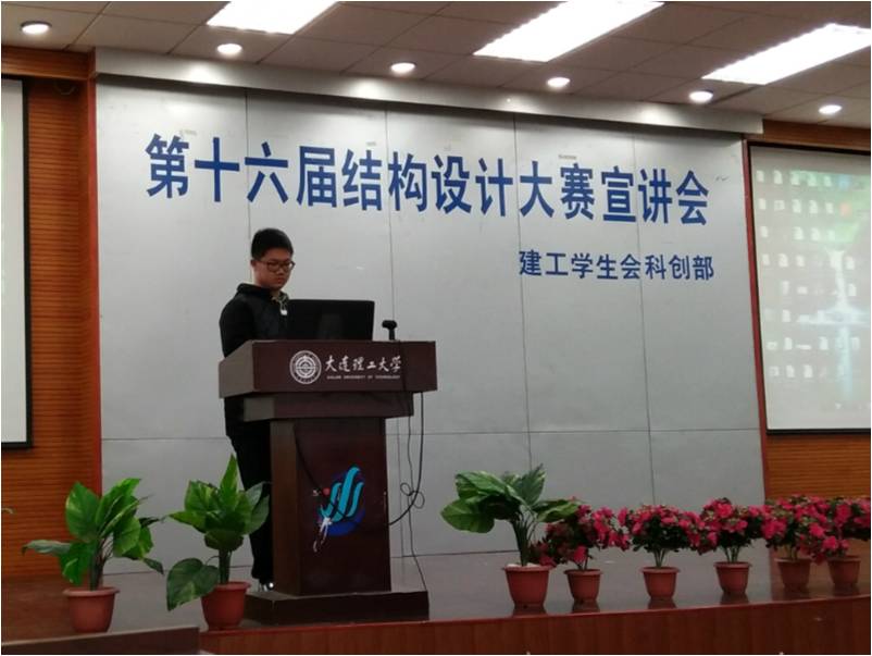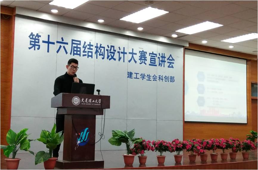 时至四月,玉兰花开;春风送暖,细雨沁心。4月19日,大连理工大学第十六届结构设计大赛宣讲会于建工系楼五楼多功能厅顺利召开。建设工程学部王吉忠副教授为同学说明赛题,土交1401班陈奕韬和土水1401班刘奇代表2016年结构设计大赛市赛、省赛、国赛队员,为同学们分享经验。