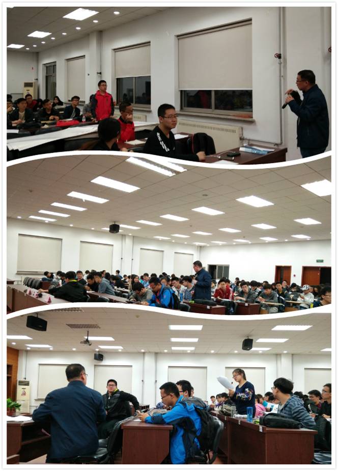 王吉忠老师为同学们讲解、分析赛题。王老师从方案选择、模型示例和注意事项几个方面给学生进行了全面说明。百余位同学认真地聆听、记录。王老师告诉同学们,要“精研赛题,敢于动手去做”、“在结构合理的基础上做到结构简化、手工精细”。结构设计是结构理论和细致手工的结合品,要注意手工的重要性。