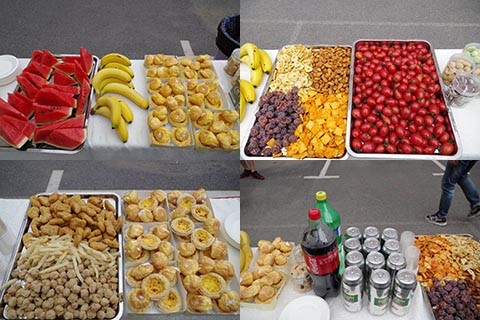 下午17:30,距离晚会开始还有半个小时,酒会现场所有的布置都已完成。综合实验3号楼后院一改往昔空旷冷清的模样:上空悬着彩带和气球,中心舞台红毯向前延伸,红毯两侧用气球映衬,一直通往八层大蛋糕。舞台的右侧布置了入场红毯、签名墙和“毕业了”合影留念处,右侧则是供应小吃、水果以及酒水的自助水吧。
