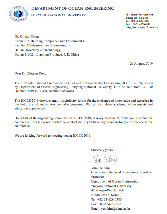 应 第18届ICCEE会议主席韩国釜庆大学YT Kim教授 邀请,我单位 董志骞 拟赴 韩国 进行学术交流。现将该团组拟出访情况公示如下: