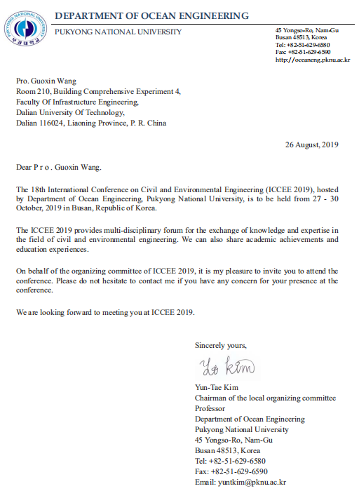 应第18届ICCEE会议主席韩国釜庆大学Yun-Tae Kim教授 邀请,我单位 王国新 拟赴 韩国 国家(地区)进行工作访问(学术交流)。现将该团组拟出访情况公示如下: