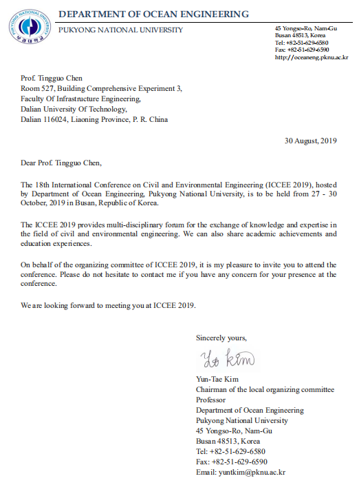 应第18届ICCEE会议主席韩国釜庆大学Yun-Tae Kim教授 邀请,我单位 陈廷国 拟赴 韩国 国家(地区)进行工作访问(学术交流)。现将该团组拟出访情况公示如下: