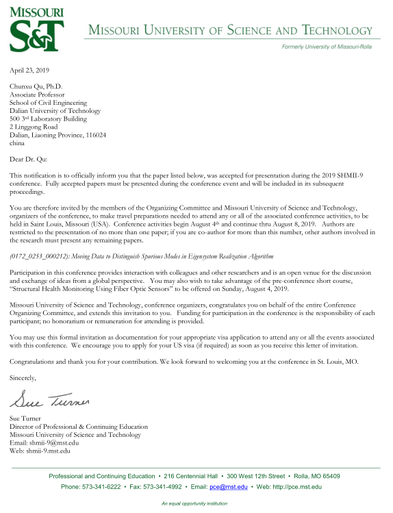 此次出访的任务是参加第九届智能基础设施结构健康监测国际会议 (9th International Conference on Structural Health Monitoring of Intelligent Infrastructure, SHMII-9),且参观密苏里科学技术大学。