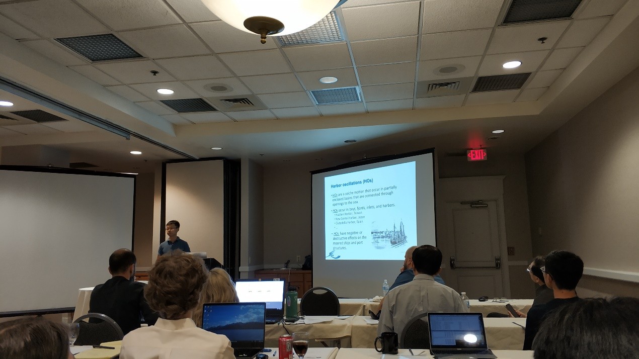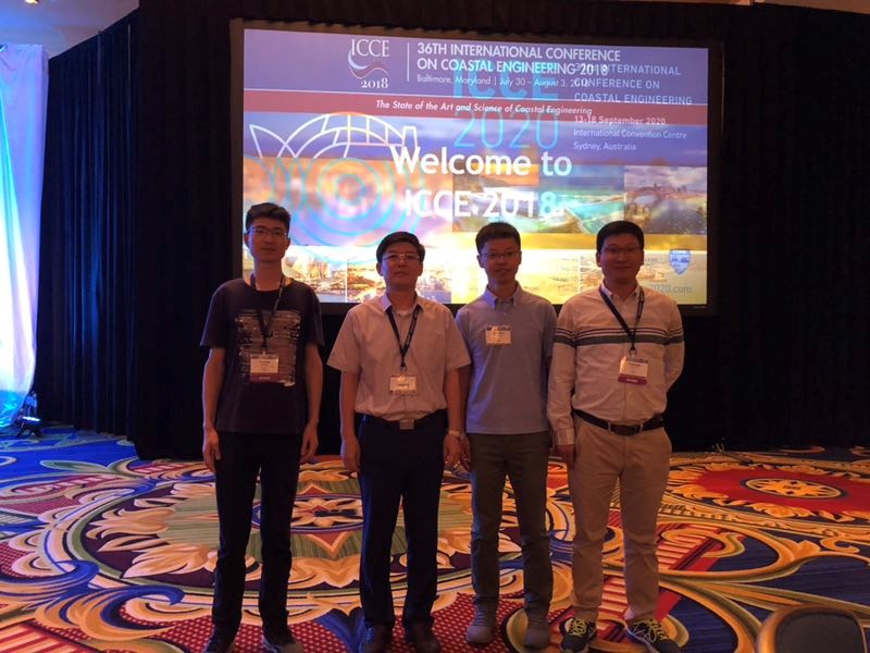在本次会议开幕式上,大会主办方为董国海教授所获得的国际海岸、海洋、港口和航道学会“海岸工程”学者称号进行了颁奖,8月2号马玉祥做了《A numerical study of freak wave generation in random seas over a submerged bar》的报告,8月3号博士生牛旭阳做了《An Experimental Study of Extreme Wave Kinematics on Opposing Depth-varying Currents》的报告,并与参会的专家学者在进行了深入的交流。