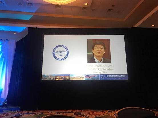 在本次会议开幕式上,大会主办方为董国海教授所获得的国际海岸、海洋、港口和航道学会“海岸工程”学者称号进行了颁奖,8月2号马玉祥做了《A numerical study of freak wave generation in random seas over a submerged bar》的报告, 8月3号博士生牛旭阳做了《An Experimental Study of Extreme Wave Kinematics on Opposing Depth-varying Currents》的报告,并与参会的专家学者在进行了深入的交流。