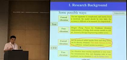 国际计算风工程会议每四年举办一次,本次到会200余人,其中中国代表60余人。本人全程参加了大会报告和分会场报告,多次提问交流。在大会上宣读了题为 “Numerical Simulation of Air-induced Added Mass and Damping of Vibrating Bridge Deck Sections under Zero Wind Speed Condition”的报告,采用数值模拟方法研究了典型桥梁断面附加气动质量和气动阻尼问题。通过此次会议,对风工程领域的研究进展有了更充分深入的了解,有利于拓展和调整今后研究方向。与国际上多位知名教授进行了交谈,增进了相互了解。
