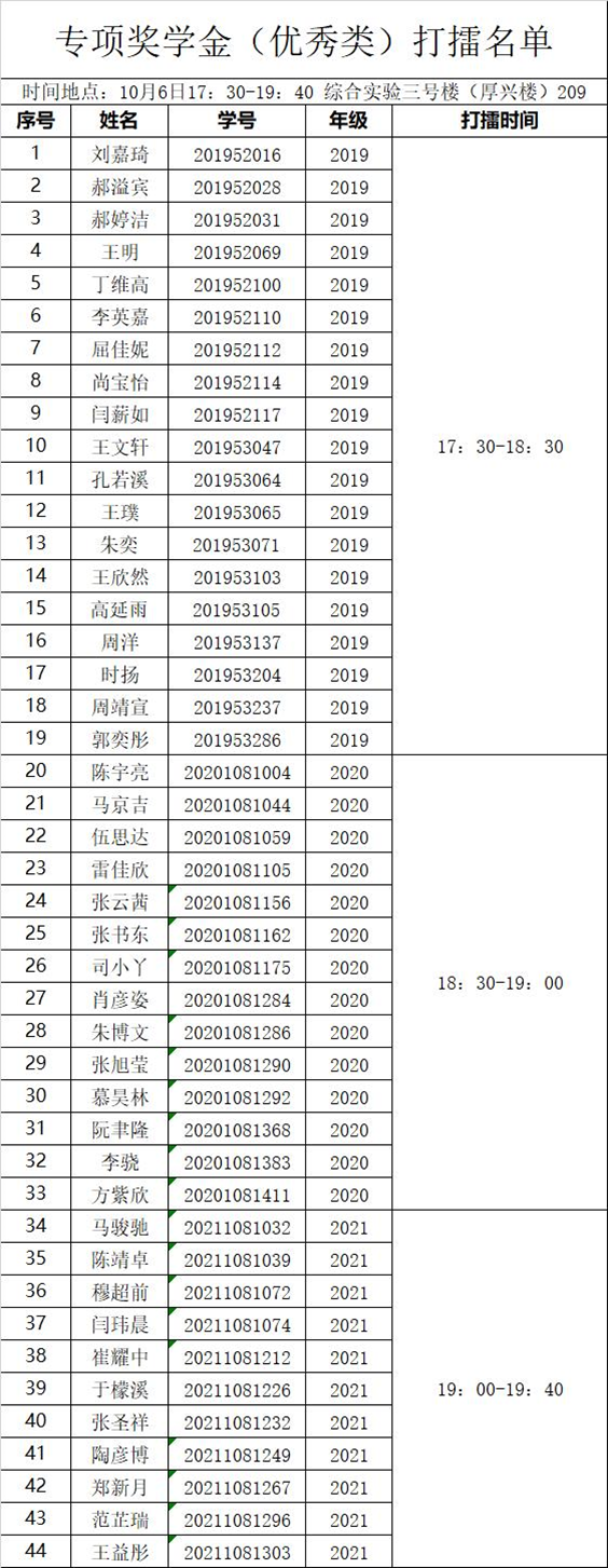 附件为建工学部2021-2022学年专项奖学金打擂申报邮箱中收到的申请人材料,请各位同学核对,若出现已按照要求发送邮件但未在名单中的情况,请于10月2日19:30前凭邮件发送截图及申请材料反映给辅导员老师。