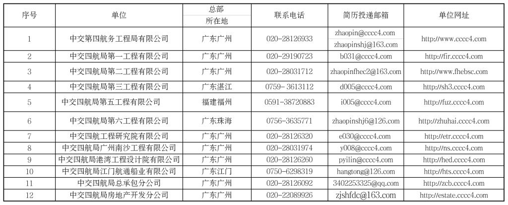 (3)有意向的学生还可将简历发送至邮箱zhaopin@cccc4.com 或zhaopinshj@163.com,也可以直接发给四航局下属的各具体招聘单位招聘邮箱,详见下表: