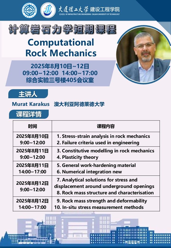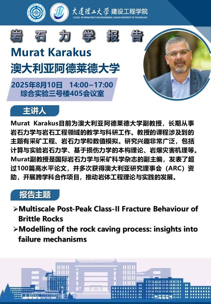Murat Karakus目前为澳大利亚阿德莱德大学副教授,长期从事岩石力学与岩石工程领域的教学与科研工作。教授的课程涉及到的主题有采矿工程、岩石力学和数值模拟。研究兴趣非常广泛,包括计算与实验岩石力学、基于损伤力学的本构理论、岩爆灾害机理等。Murat副教授是国际岩石力学与采矿科学杂志的副主编,发表了超过100篇高水平论文,并多次获得澳大利亚研究理事会(ARC)资助,开展跨学科合作项目,推动岩体工程理论与实践的发展。