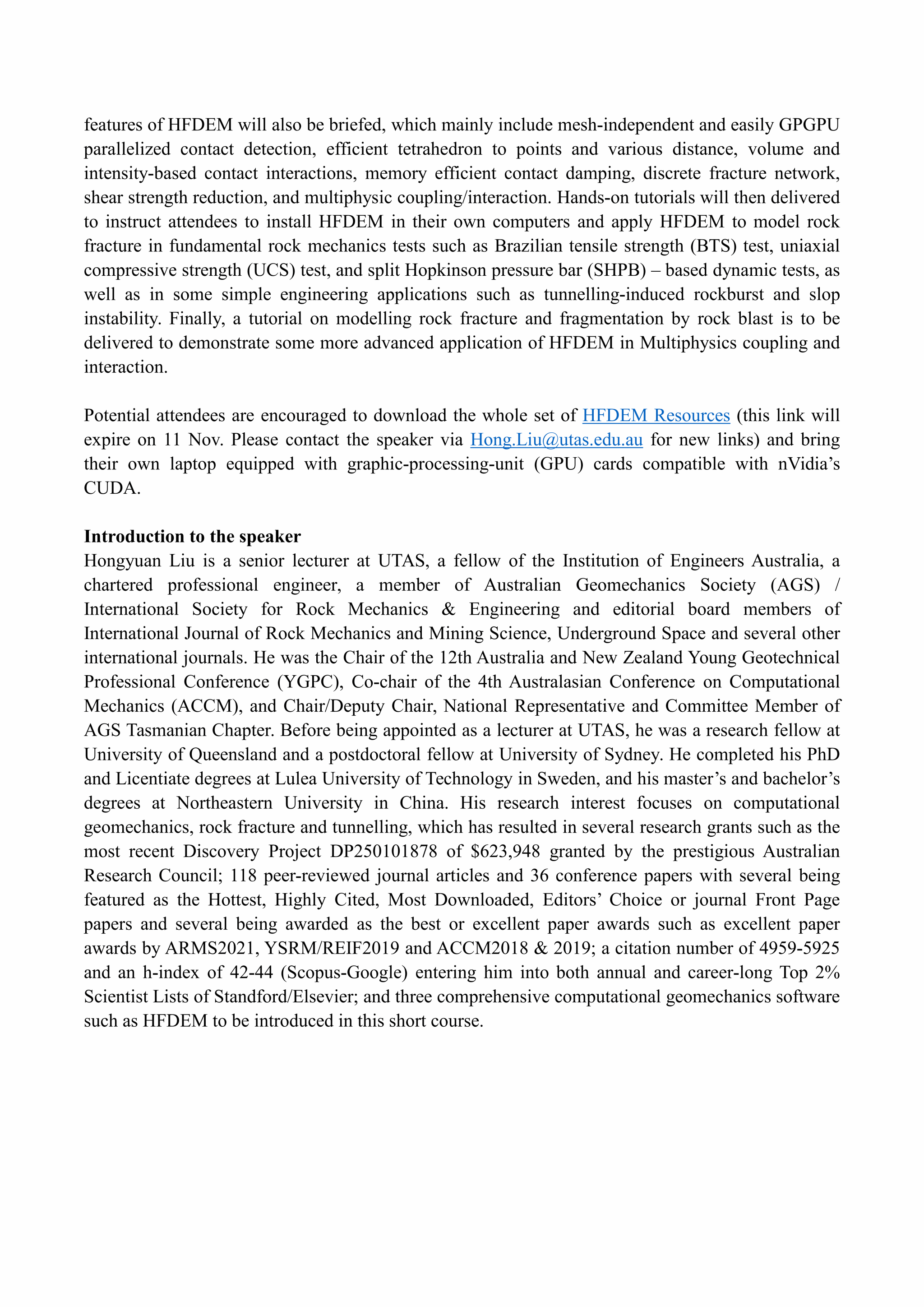 刘红元现任澳大利亚塔斯马尼亚大学拥有终身教职(tenured)的高级讲师、博导和墨尔本大学兼职博导。他曾是昆士兰大学研究员和悉尼大学博士后,他博士毕业于瑞典吕勒欧理工大学、硕士和本科均毕业于东北大学。他现在是澳大利亚工程师学会的Fellow (FIEAust)、注册工程师 (CPEng)、International Journal of Rock Mechanics and Mining Sciences和Underground Space等5个国际SCI期刊编委,曾任澳洲岩土力学学会塔斯马尼亚分会主席,第十二届澳洲青年岩土力学会议主席和第四届澳洲计算力学会议共同主席。他长期致力于计算力学、岩土结构破坏与失稳和隧道掘进与支护方面的研究,在计算岩土力学,隧道机械掘进和岩体爆破等领域享有国际声誉。近十年来他领导一个国际团队专注开发杂交有限元和离散元高性能计算系统HFDEM,实现了岩土体从变形、破裂到破碎、运动和堆积的全过程模拟。HFDEM的开发和应用已获包括澳洲最负盛名的Australian Research Council Discovery Project等多项研究基金的资助。他领导的团队的系列研究获得多项国内和国际奖如第11届亚洲岩石力学优秀论文奖(2021)、澳洲岩土力学学会最佳博士论文奖(2020)、国际岩石力学和工程学会第五届青年岩石力学会优秀论文奖(2019)、第三、四届澳洲计算力学会议最佳论文奖(2019和2018)、第12届澳洲和新西兰岩土力学会议最佳论文奖等(2012)。到目前为止,他已经发表了SCI学术论文100余篇,其中多篇被选为热点、高被引、下载次数最多、编辑最喜爱和杂志封面论文,论文总被引用逾4900(Scopus)/5900(Google Scholar)次,H-index是42(Scopus)/44(Google Scholar),这使得他自2024以来被入选斯坦福/爱斯维尔顶尖2%科学家年度和职业生涯榜单。