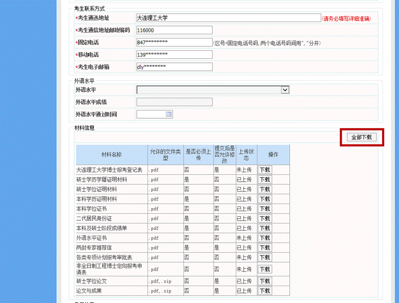 在考生报名信息页面材料信息部分点击“全部下载”,可下载查看考生全部报名材料。