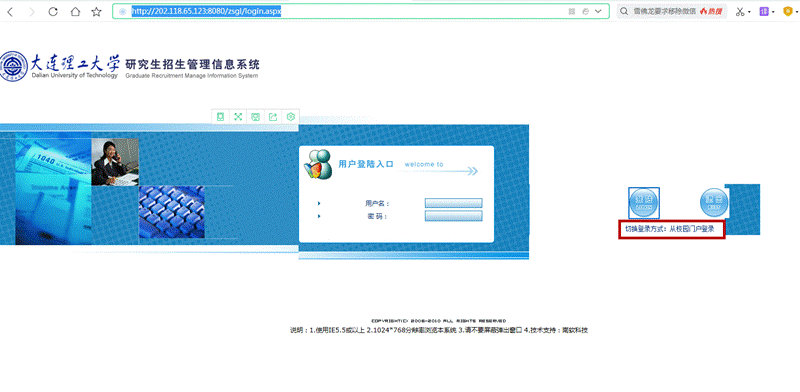 登录方式:招生导师该页面点击“切换登录方式:从校园门户登录”按钮,链接到校园门户,输入教工号和密码,进入系统。