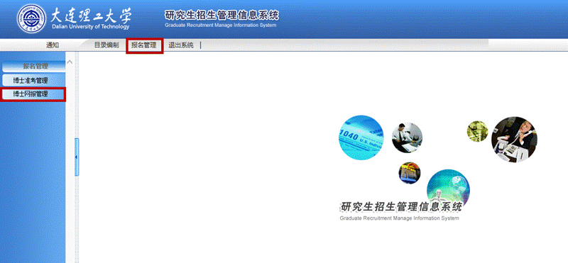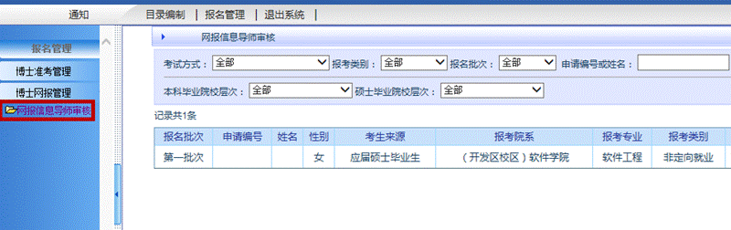 点击“报名管理”后,点击“博士网报管理”可查看本人名下博士考生报名情况
