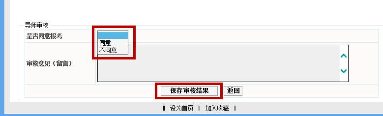 考生报名信息页面中导师审核部分,招生导师选择是否同意报考,可在留言栏填写意见,点击“保存审核结果”返回。该审核结果为导师最终报考意见,招生导师不需要在纸质版《博士报考登记表》上签字。
