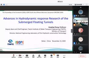 The opening ceremony began at 8:30 am on November, 23th. It was hosted by Prof. NING Dezhi and was broadcast live simultaneously. More than 150 people attended the online conference. The video-form summary of the PACOMS history prepared by Prof. JIN Chung, the chairman of ISOPE, was played. After that, Prof. LI Yucheng, one of the founders of the PACOMS, delivered a welcome speech, and on behalf of the executive committee, presented the ISOPE PACOMS-Award plaques to the chairmen of the conference, Prof. TENG Bin and Prof. NING Dezhi for their invaluable contribution to the organization of fourteenth ISOPE PACOMS. Prof. TENG Bin presided over the keynote address of the conference. Prof. ZHANG Huaqing, vice president and chief Engineer of Tianjin Research Institute for Water Transport Engineering of the Ministry of Transportation, gave a keynote address entitled "Advances in Submerged Floating Tunnel Research". After the opening ceremony, five sessions were held for participants to discuss and exchange ideas.