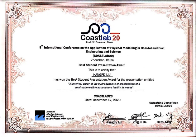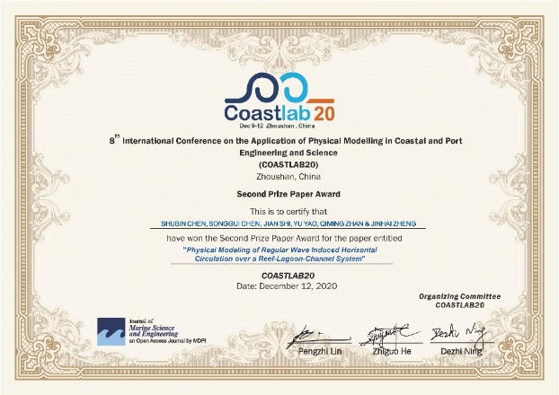 Coastlab2020 covered 12 sessions during the 9th-12th of December. More than 120 online and on-site presentations were held. A total of more than 400 join the activity around 56 countries with more than 300 conference manuscript received including more than 240 experts were presented on site. A total of more than 11,000 participants joined the event through website. 22 members from SLCOE of DUT joined the conference, led by Prof. Dezhi Ning. Mr. Hangfei Liu (supervised by Prof. Yunpeng Zhao) and Dr. Fan Yang in the Stake Key Laboratory of Coastal and Offshore Engineering were awarded as the Best Presentation Award and the Best Paper Award respectively in the closing ceremony.