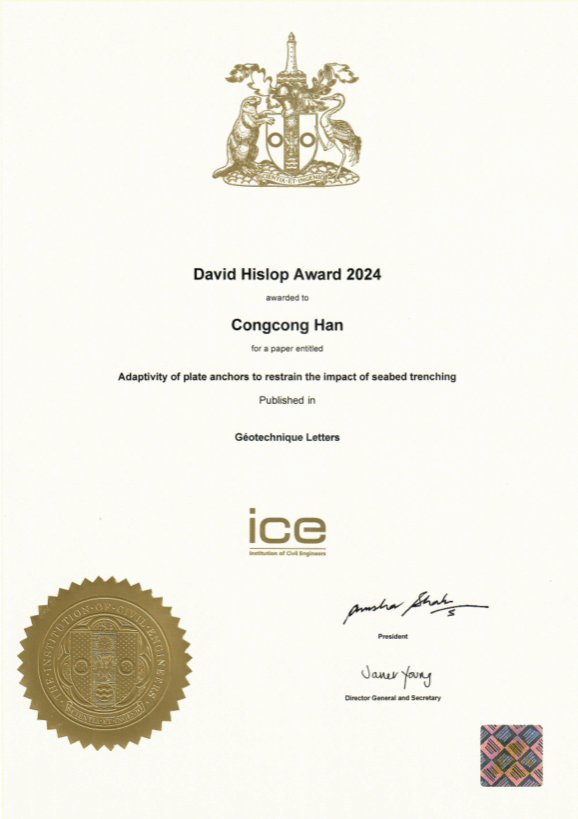 David Hislop奖又称Offshore Award,以国际土木工程领域著名岩土工程师David Atholl Hislop(1928-1973)命名。该奖项最初每三年颁发一次,自从1975年起,每年从上一年度ICE发表学术论文中遴选一篇最佳论文,以表彰作者在海洋工程设计和施工方面取得的突出贡献。据悉,英国皇家学会会员Mark Randolph院士、澳大利亚工程院院士Mark Cassidy教授、牛津大学Guy Houlsby教授、帝国理工大学Richard Jardine教授等都曾获此奖励。