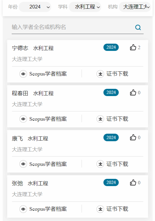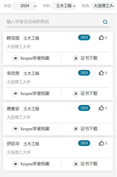2025年3月25日,爱思唯尔(Elsevier)发布 2024“中国高被引学者”(Highly Cited Chinese Researchers)榜单。我院程春田教授、康飞教授、宁德志教授、张弛教授、韩宝国教授、李宏男教授、唐春安教授、伊廷华教授上榜!