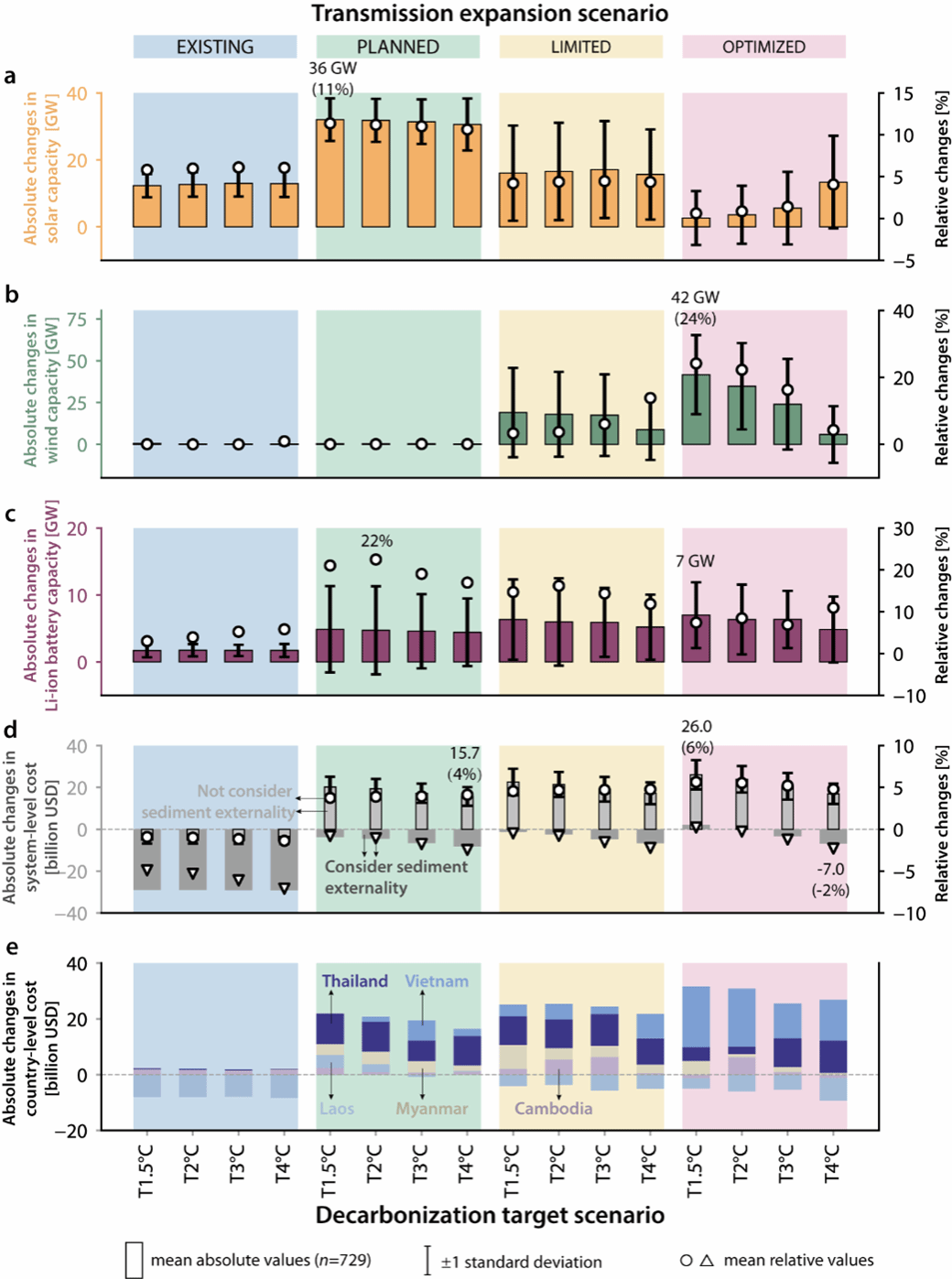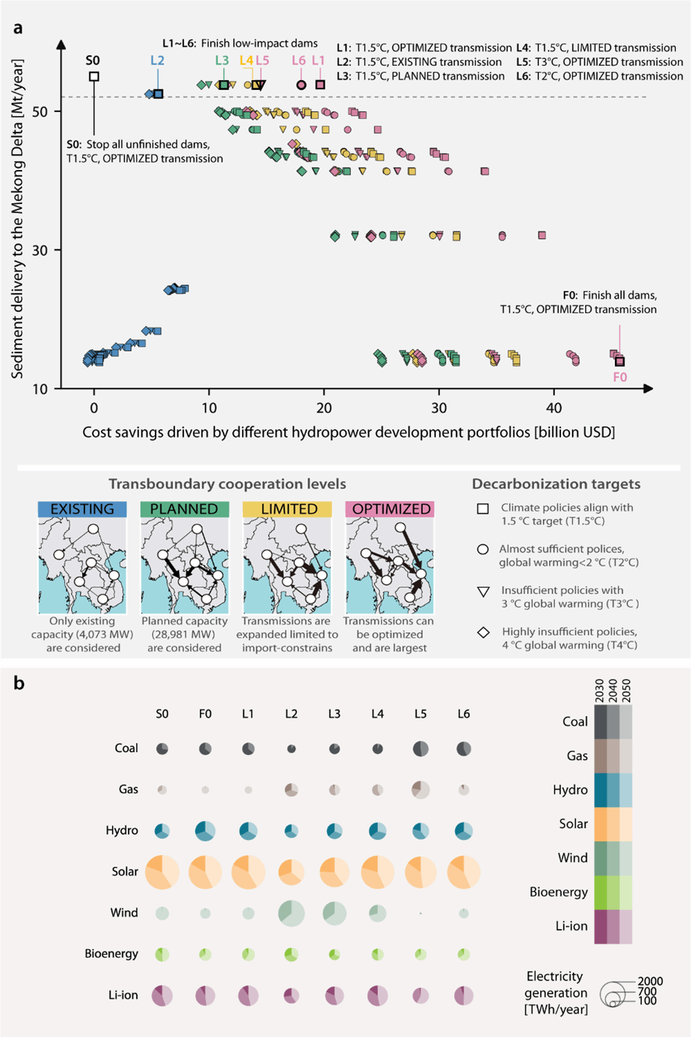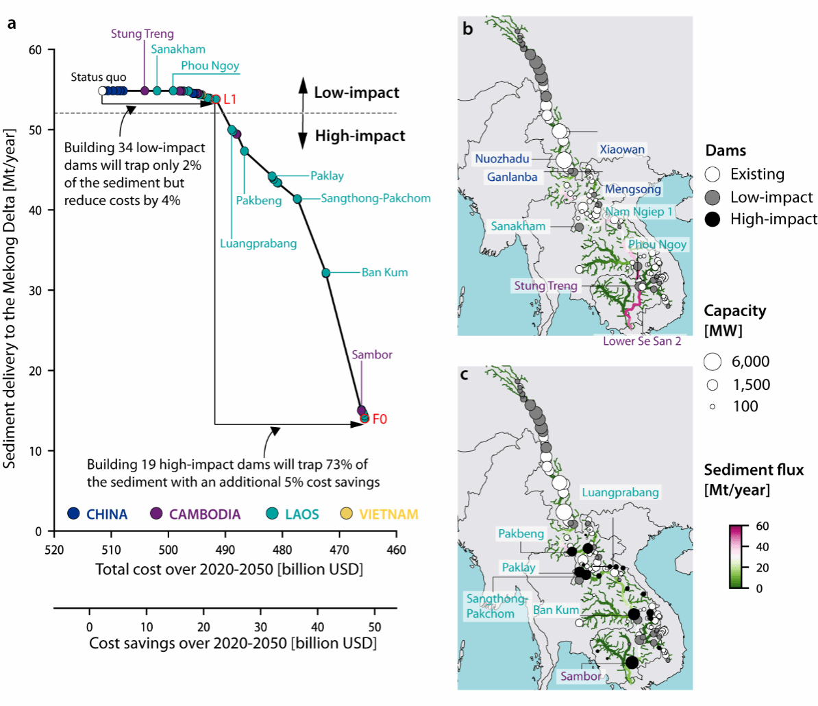 图1. 不同水电开发方案对能源系统成本与湄公河三角洲泥沙供应的影响